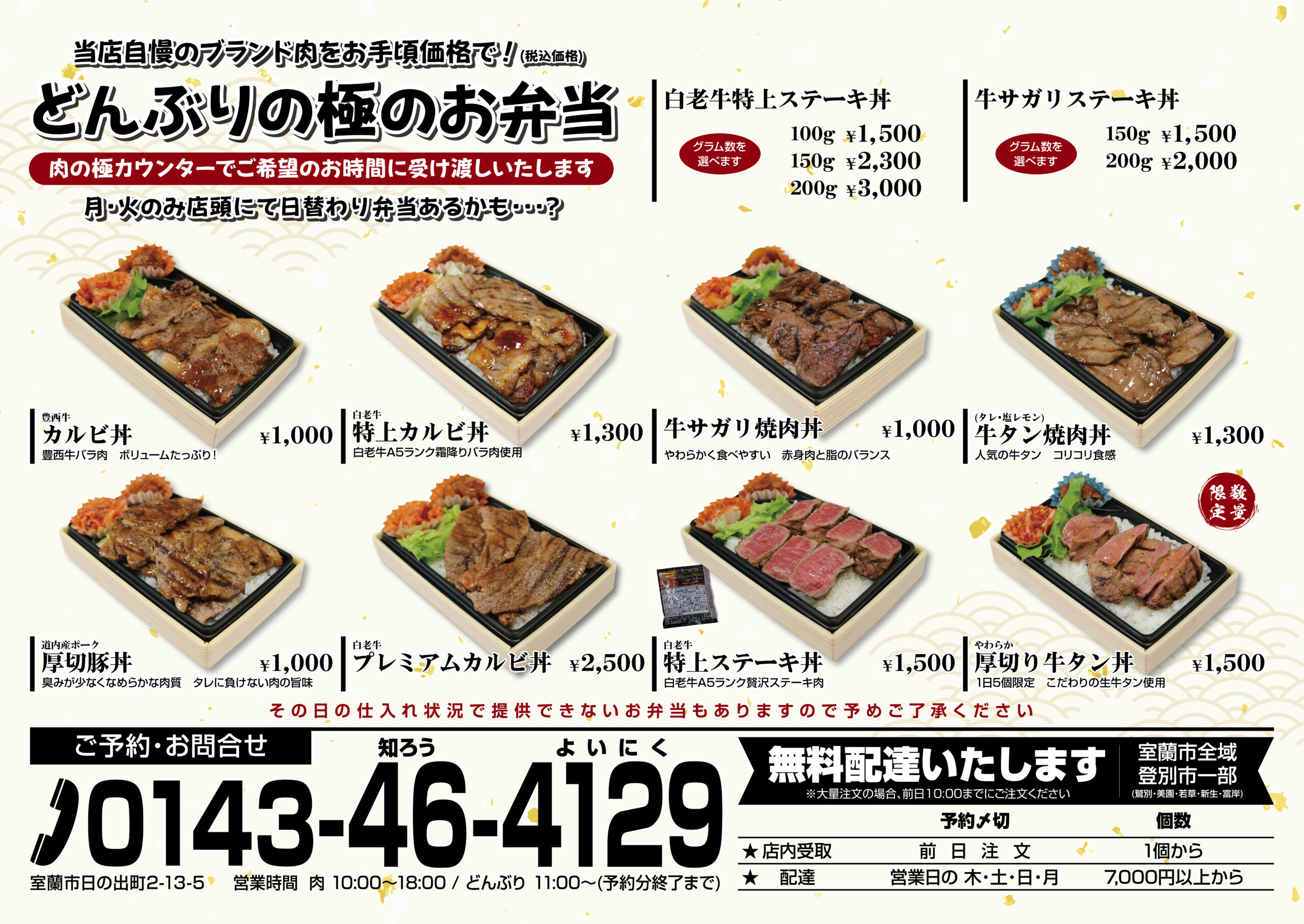 - 配達エリア 室蘭市・登別市・伊達市(伊達市に関しましては5,000円以上で配達いたします)